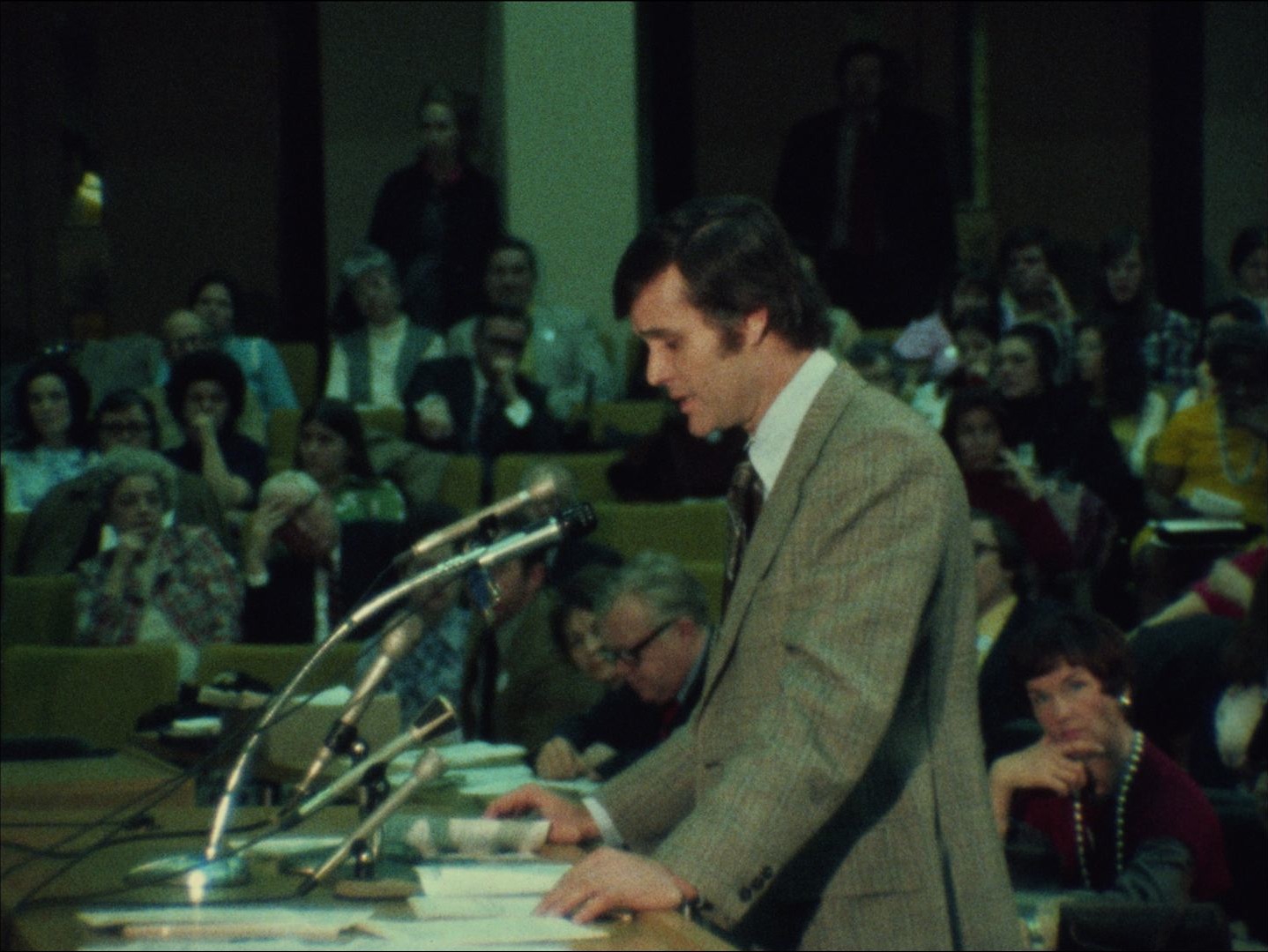 Leader: F1 Reserve Bank Line #9577 8/7/74; Silent footage of people lined up outside the Federal Reserve Bank in Boston. Guards open the door and let people in.