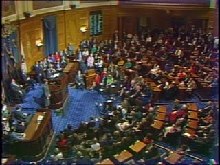 Via slow-scan video from the Paris World Trade Center, Michael Dukakis holds a transatlantic press conference on his trade mission. He does not wish to discuss Evelyn Murphy.