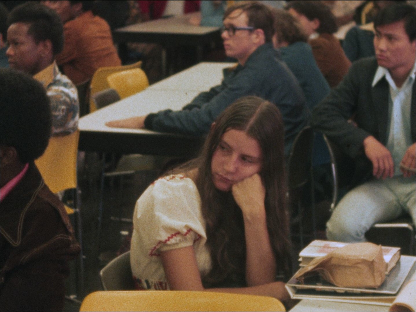 Description: Leader: P1 School Hours #6998 1/13/74 (shot 1/12); Silent footage of students inside a school. A bus stop picks up kids in the dark. Interview with Boston school superintendent William J. Leary about daylight savings and children safety. [More of the interview with Leary in Acc. 2394.01808]