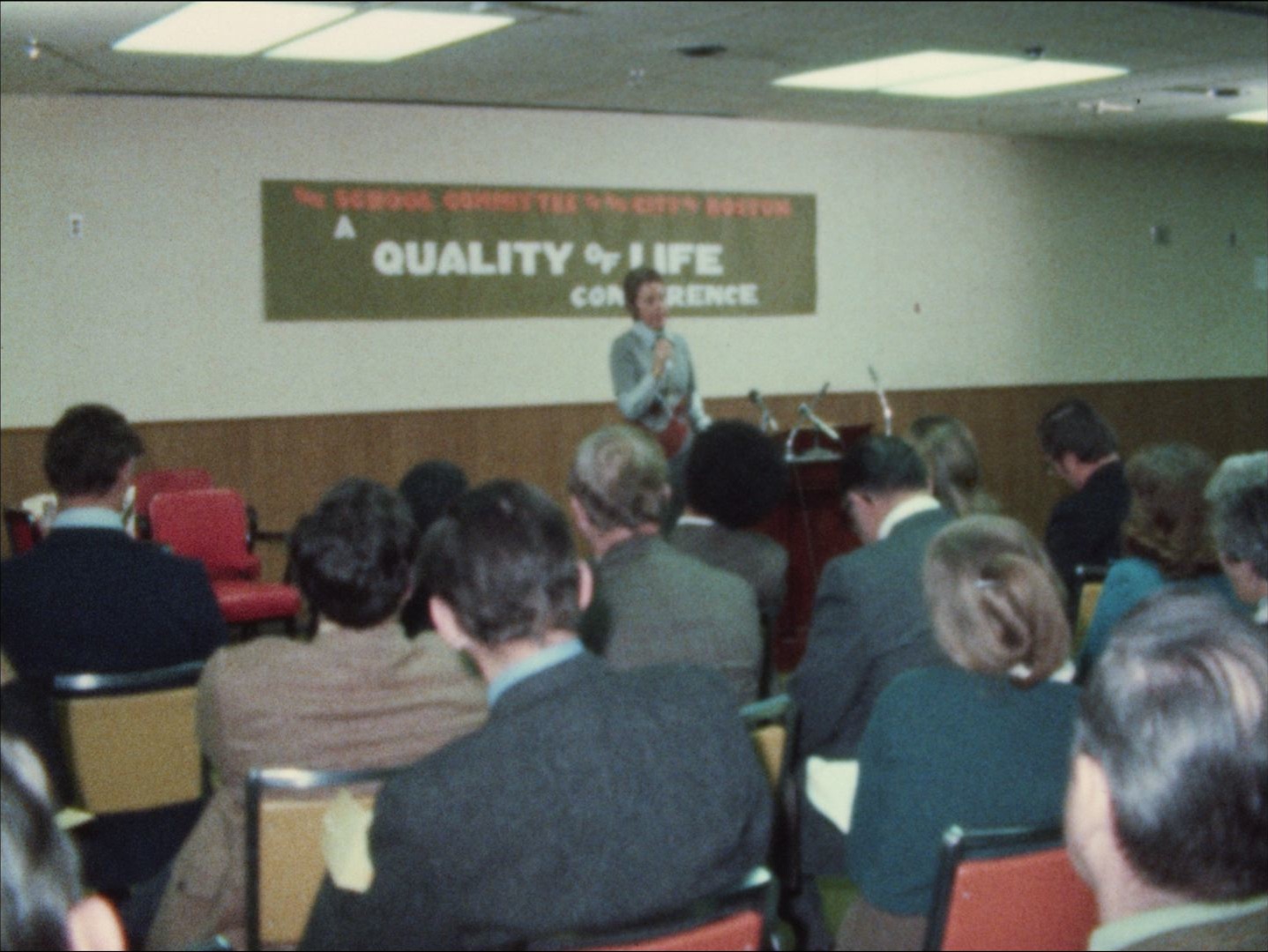Description: Leader: P2 Education Conference #6997 1/12/74; A seminar for educators about the quality of life for students in Boston held at the Camp Resources Center in Dorchester. Silent footage of a man speaking to an audience in front of a banner that reads The School Committee of the City of Boston: A Quality of Life Conference. B-roll of the audience. Interview with one of the speakers, Dr. Pamela Cantor, about teaching methods. Mix of silent and sound footage of the event and more of the interview with Cantor. Unrelated footage of an interview with Boston school superintendent William J. Leary. [This footage belongs with Acc. 2394.01806]