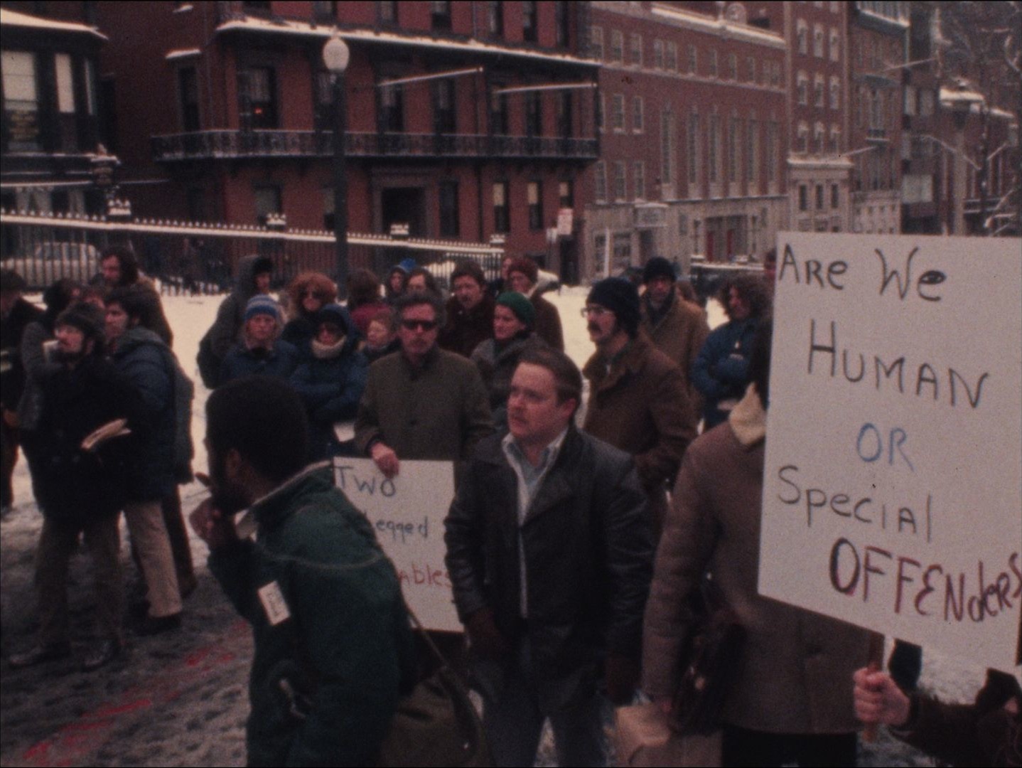 "Leader: "P2 N.E. Gov's #7255 2/7/74"; Silent footage of a protest, aerial footage of large complex. A man speaks about the need to treat prisoners as humans, silent b-roll of th New England Governor's Conference. Reel 1 of 2. See Acc. 2394.01420"