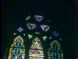 Interior of Holy Cross Cathedral. Stained glass and rose windows, gothic arches, pews, vaulted ceiling. Altar with gilded virgin Mary and baby Jesus. Organ music.