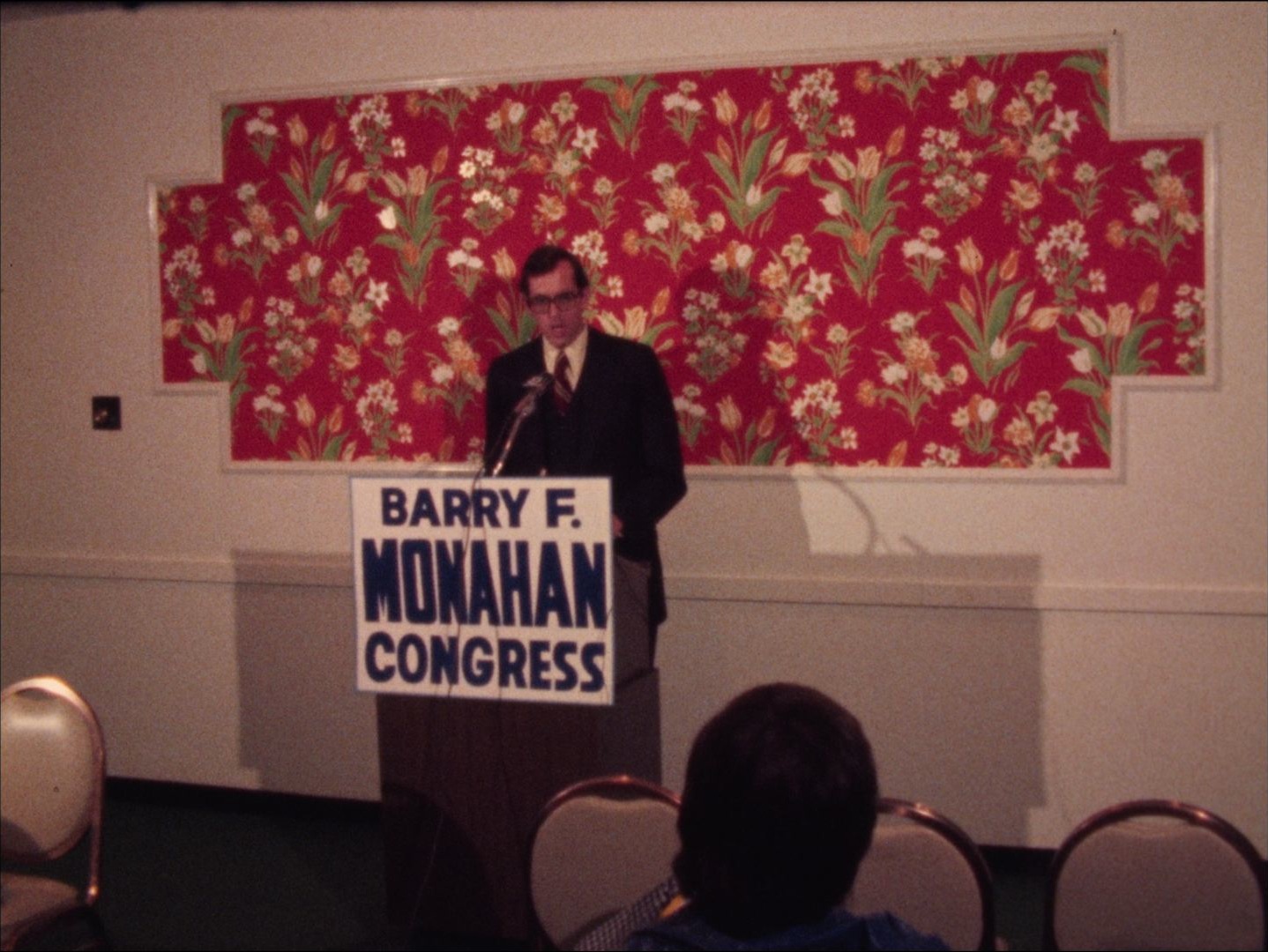 Description: Leader: P1 Monahan #7907 4/15/74; Press conference with Barry F. Monahan, democratic nominee running against Margaret Heckler for United States Congress.