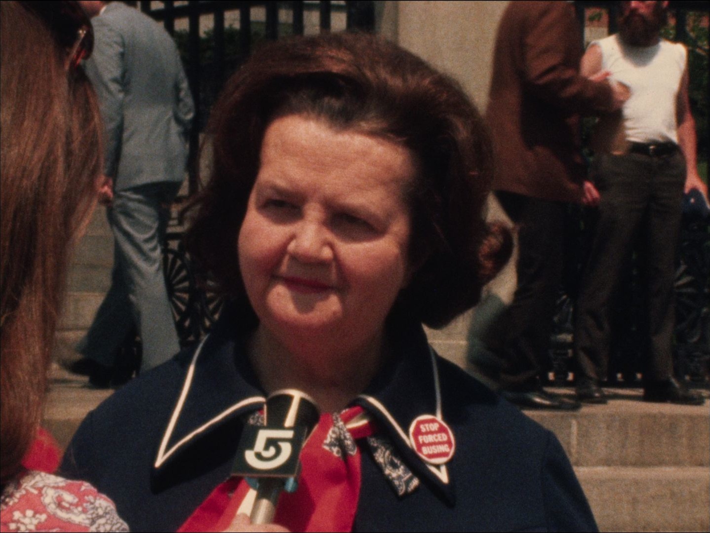 Description: Leader: P2 Busing Vigil #8055 4/29/74; Interview with Boston City councilwoman Louise Day Hicks about a 24 hour vigil to oppose busing. Natalie Jacobson reporter standup. Protesters carrying anti-busing signs march in front of the Massachusetts State House. Interview with a black woman (Mrs. Small) who is pro-busing. Reporter outtakes. Silent and sound footage of the protesters. More of the interviews with Mrs. Small and Hicks. [Audio warbles]