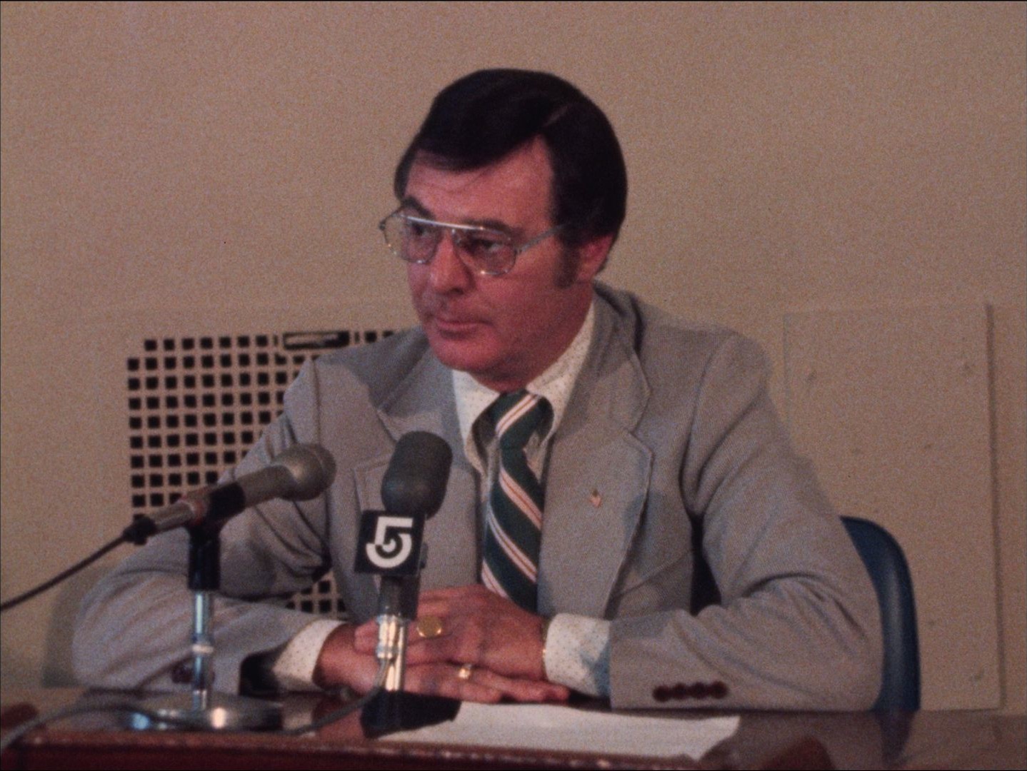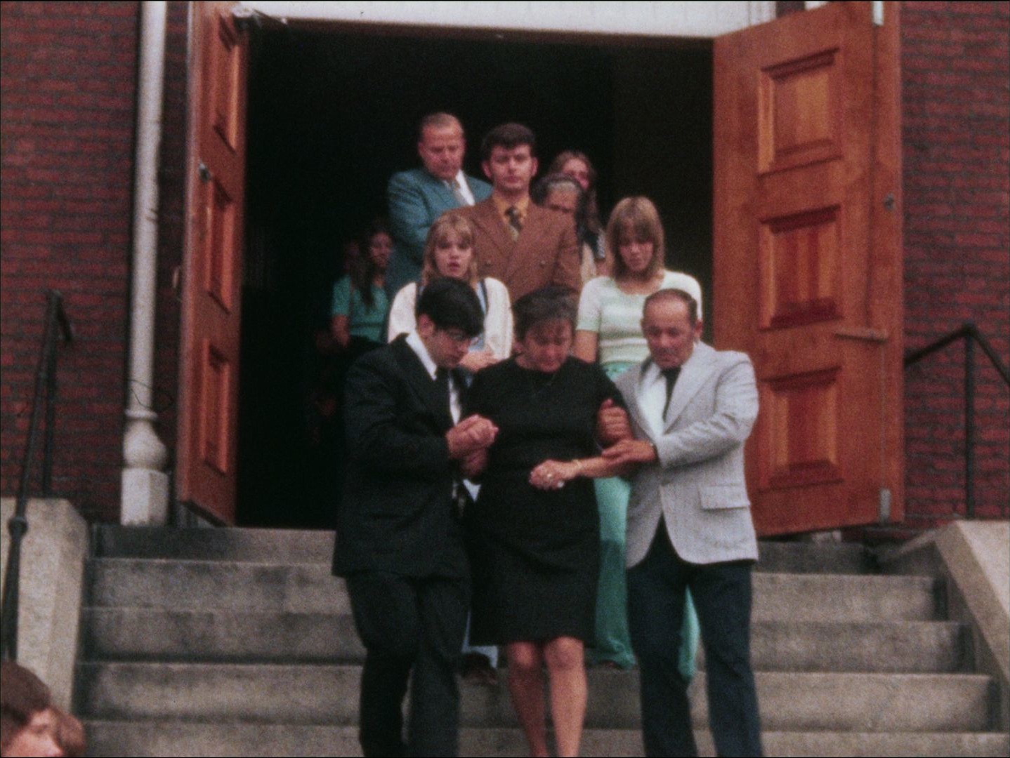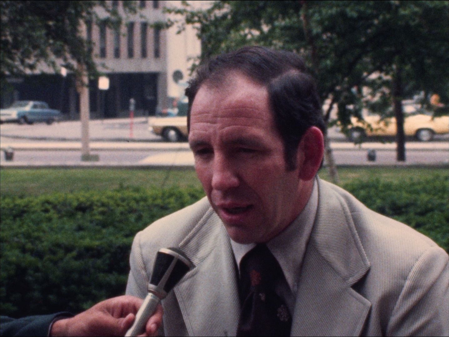 "Leader: "P2 Black Ministers Alliance - Busing #9112 6/20/74"; Silent b-roll of a black priest and others speaking to the press on the sidewalk outside the Massachusetts State House. "