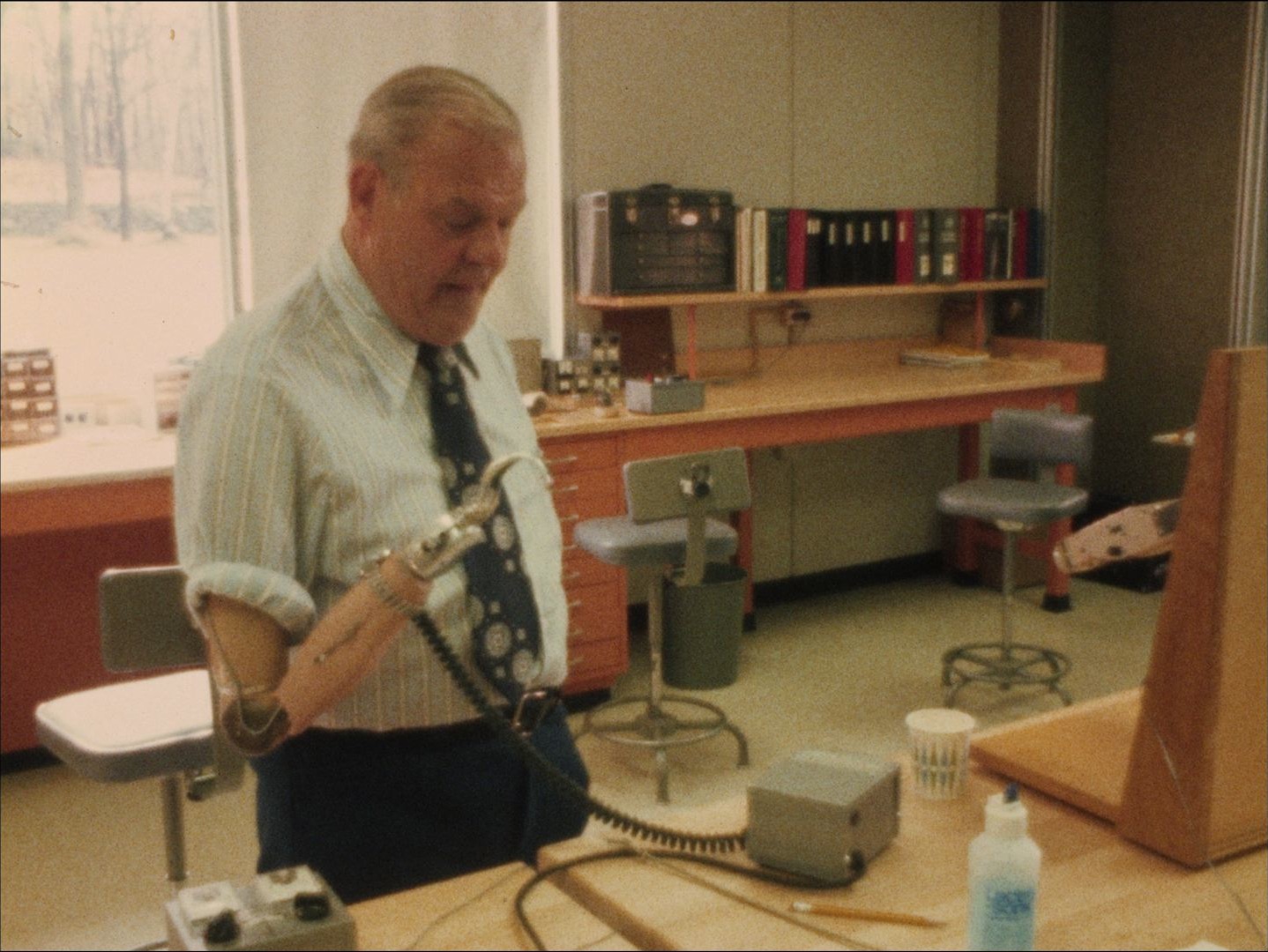 Leader: P2 Boston Arm #10490 11/13/74; A man demonstrates an electric prosthetic arm. Silent footage of a lab with electronics and a test rabbit. A man shows the prosthetic to the reporter and describes what features he wold like to see added. Roger Goodrich reporter standup followed by outtakes. More of the demonstration of the Boston Arm.