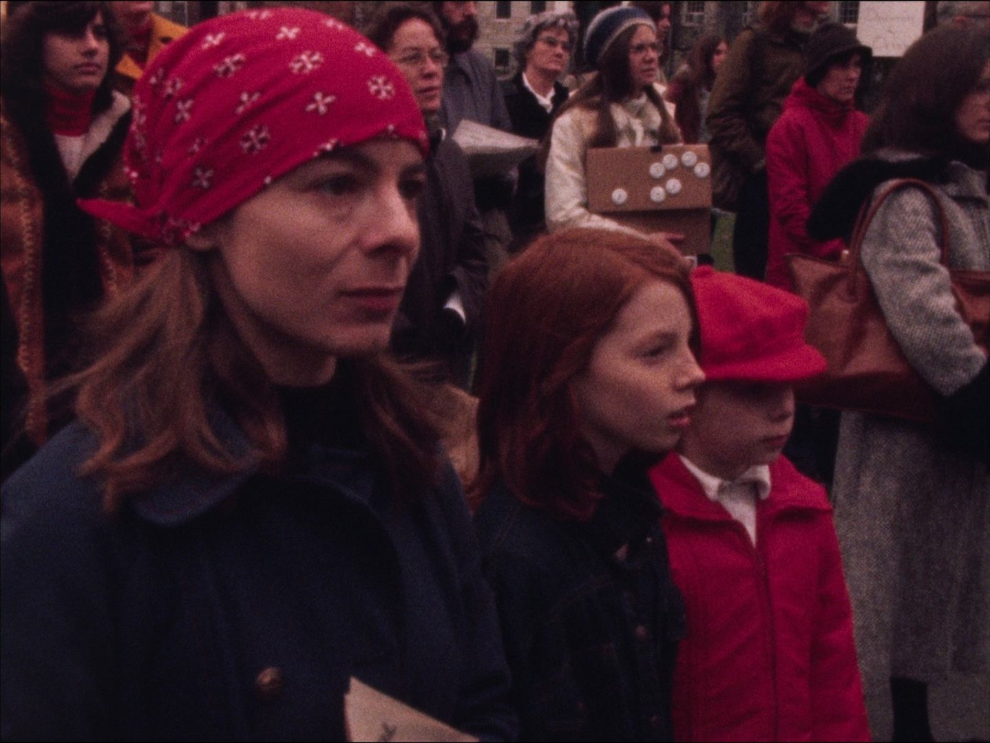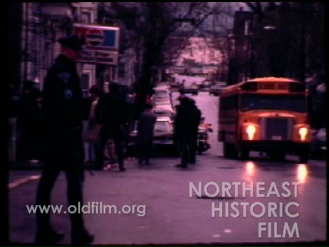 Description: "magnetic sound, color. Edited story [30 ft], cuts [170]. South Boston bussing story. Shots include: School bus with police escort, police around school, kids walking in school, African American kids getting off bus, police and crowd around entrance. Edited story followed by cuts."
