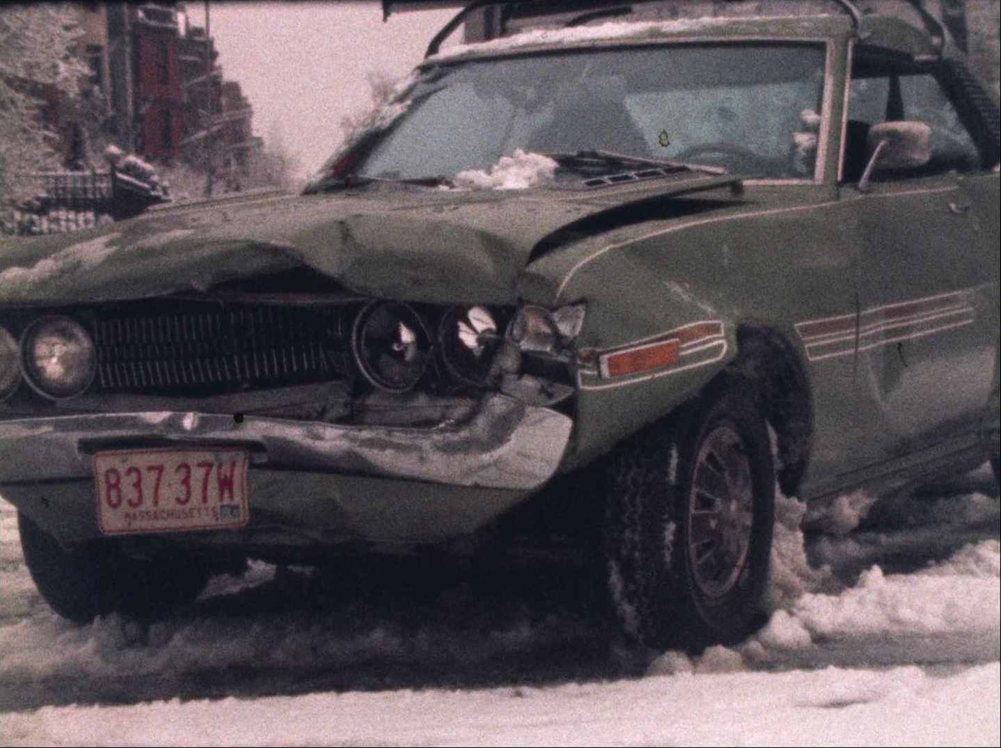 Description: "No leader on the outside of reel. Leader inside: "Melrose Fire 12/25/74"; Silent footage of an accident, fire, and children playing in the snow. Footage of a car smashed against a tree in the snow. Bridgewater police car on the side of the road. Police man examine the accident; Firemen at a burnout house; Kids throwing snow balls and a man shoveling. Firemen going in and out of a house after a fire; firemen around a fire truck; close up of burnt and still smoking debris in the snow."