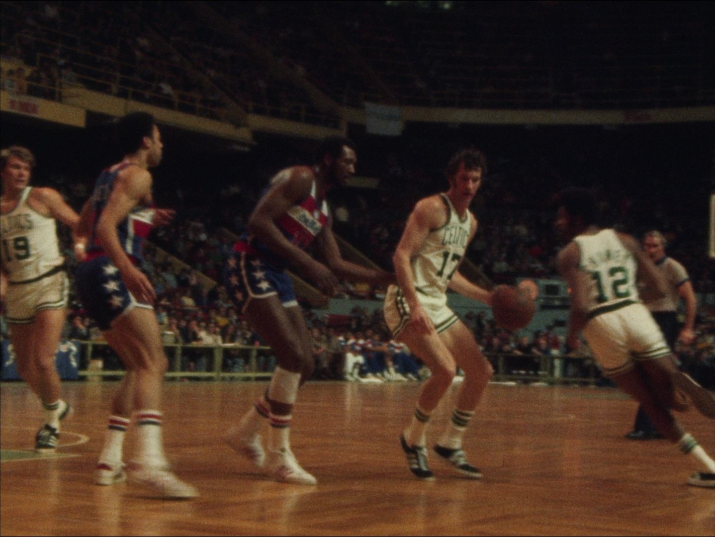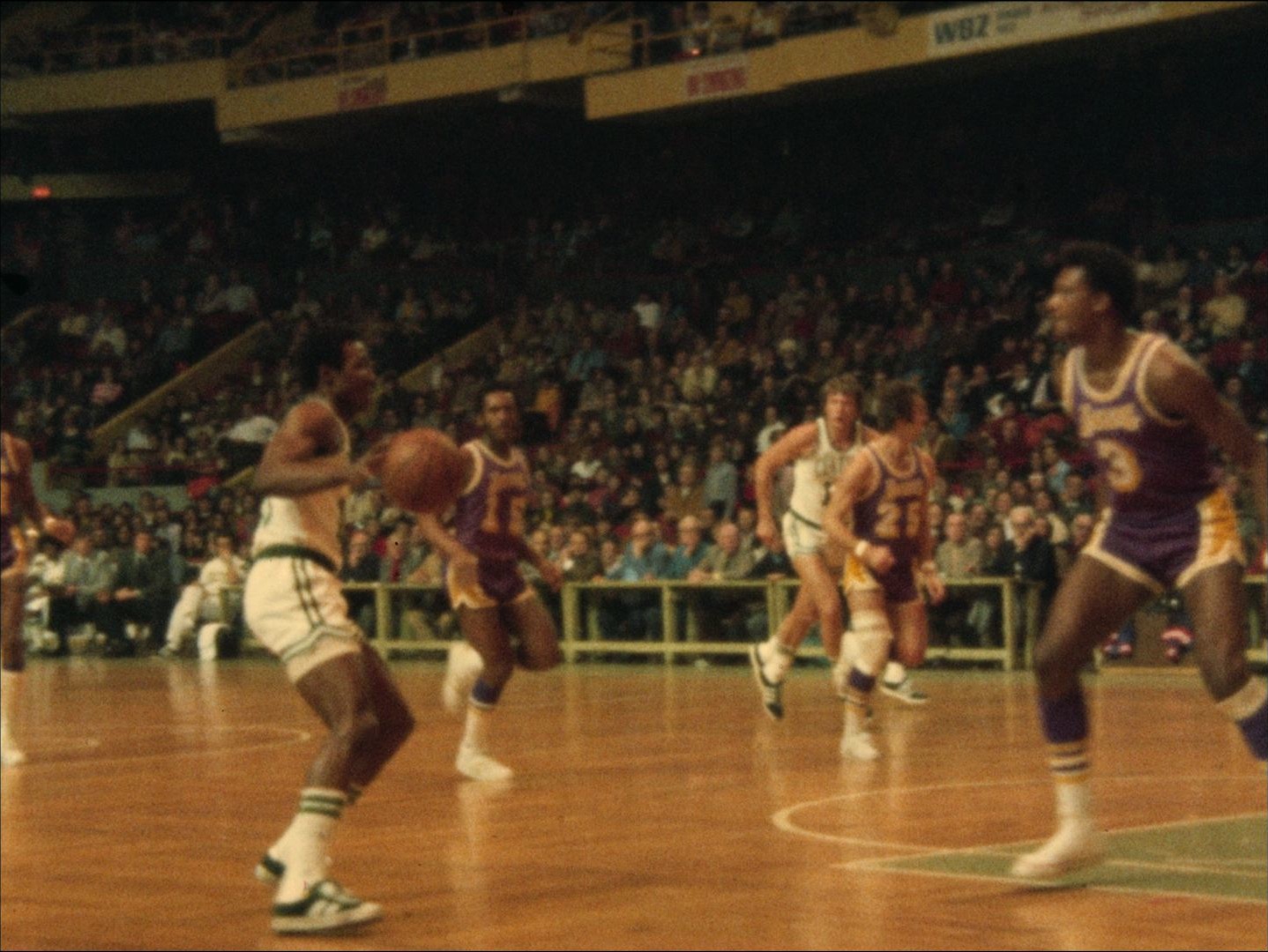 "Leader:"Celtics Celebration 5-14-74"; Ticker tape parade; Havlicek thanks crowd; players in cars; crowd celebrates & chants; shot of end of game; cake, players and families eating; interview with Auerbach; "