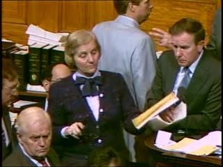Gov. Edward King's first budget address for FY80 before joint legislative session in House chamber (Constitutional Convention). Speaker Tom McGee forcefully bangs gavel. Senate President William Bulger announces entrance of the governor and Lt. Gov. Tom O'Neill. Rep. Robert Larkin, James Collins, Chester Atkins. Increase in local aid. “The people of Massachusetts do not want and do not deserve an ever expanding, ever more expensive state government. They do deserve and obviously want a government that provides the essential services they need at a price they can afford.” Goals: 1) reduce property taxes and stimulate economic development; 2) provide essential services to those most in need of care; 3) initiate improved management techniques in daily government operations. Man smoking pipe. King refers to high technology social contract (reducing individual taxes to level found in competing industrial states in exchange for job creation).