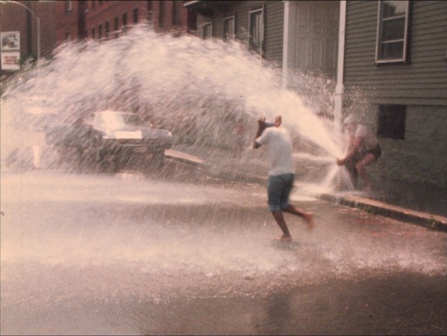 Description: "Leader: "P1 Weather Film #9299 7/9/74"; Silent footage of men paving a road, children playing in a fire hydrant, police going around a building and into the basement."