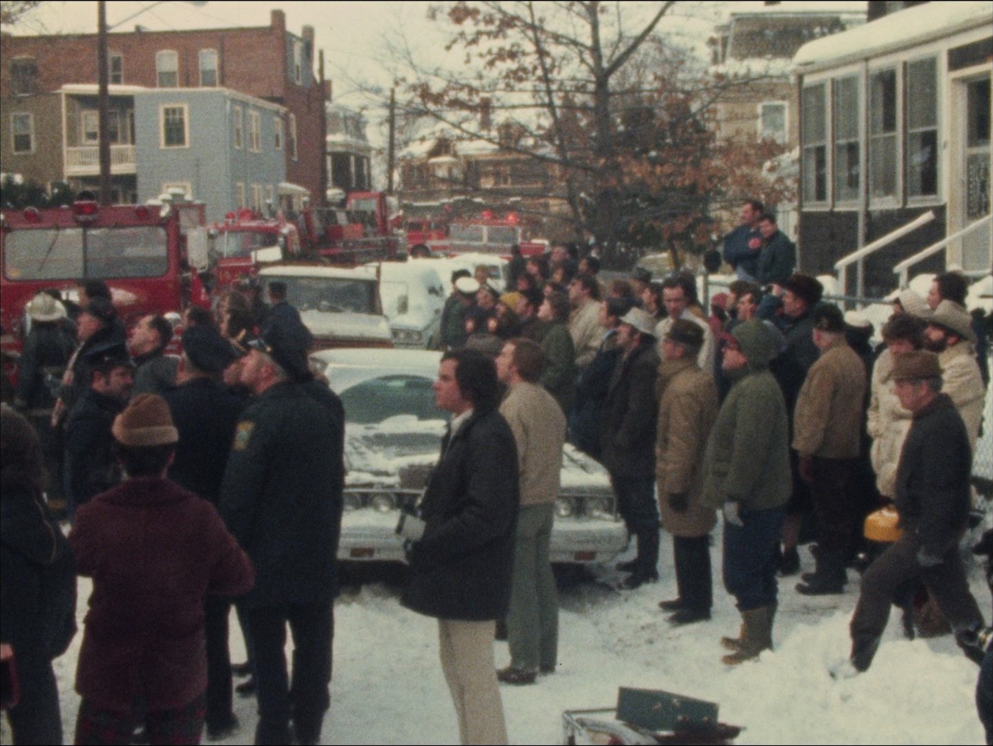 Description: Leader: P1 Allston Fire #7212 2/4/74; Daytime house fire. Firemen fight the fire and go in and out of the house. A crowd watches.