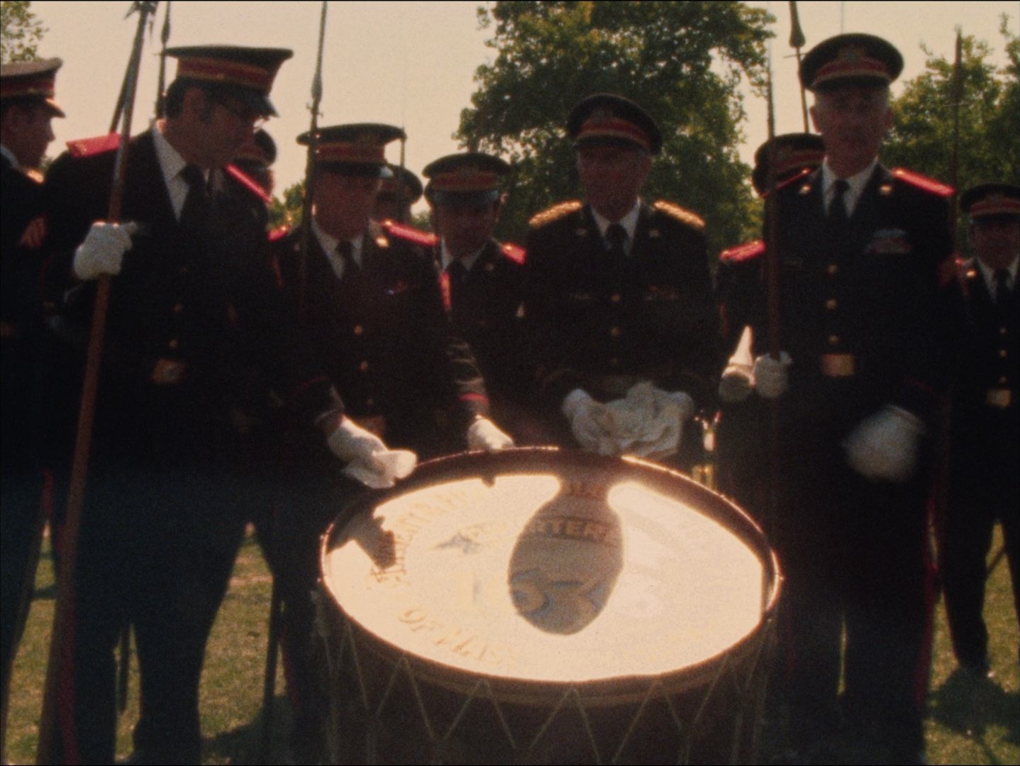 Description: Leader: P1 Drum Head Elections #8934 6/3/74; Footage of the celebration of the 336th election of the head of the Ancient and Honorable Artillery Company of Massachusetts. Men in uniform march down the street in a parade, pose next to a large drum, and fire a cannon in Boston Common. Captain Robert L. Marr is announced as the new captain. More footage of the parade and celebration.