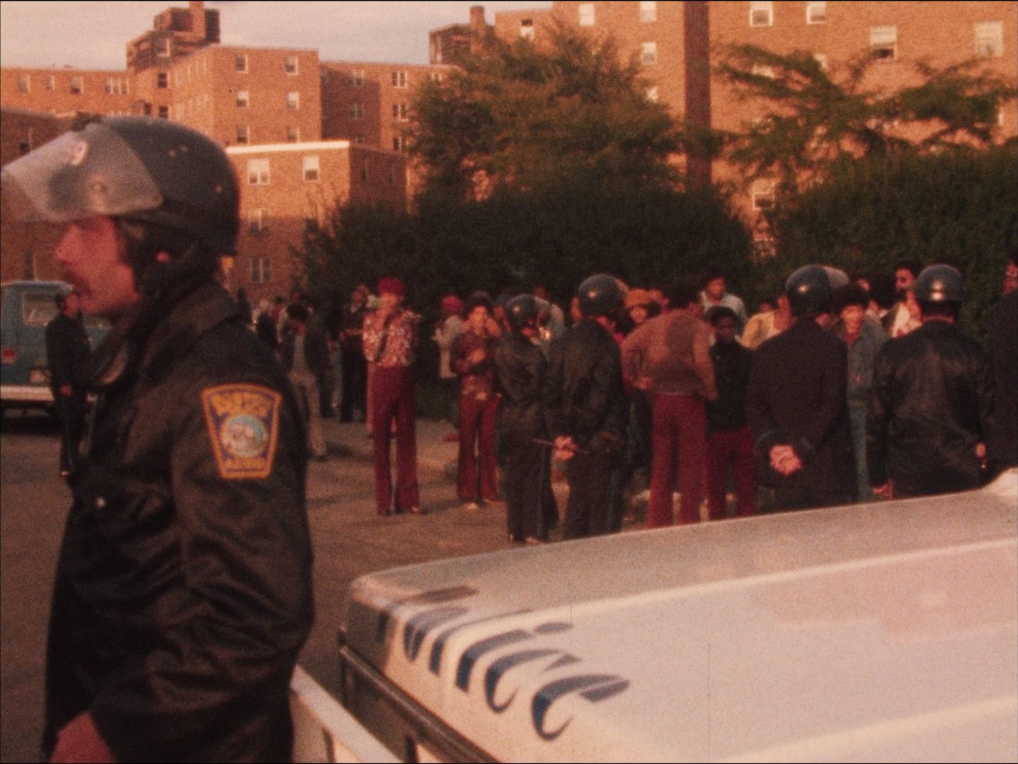 Description: Leader: P1 Col. Point Takeover #10039 9/26/74; Police in the street and on the roof of the Columbia Point Housing Project. Police and residents outside a building. Police with guns guard the entrance of the community center. Interview with a police officer about taking control of a building due to shots being fired at police officers. Interview with resident about shootings that occurred over the weekend and the increased police presence. Silent footage of police vehicles and officers on the street with residents; police remove equipment from a van; more of the police captain speaking to the press about the violent incidents in the community that precipitates police taking control and setting up a command post in the community center. [Image unstable in sections]