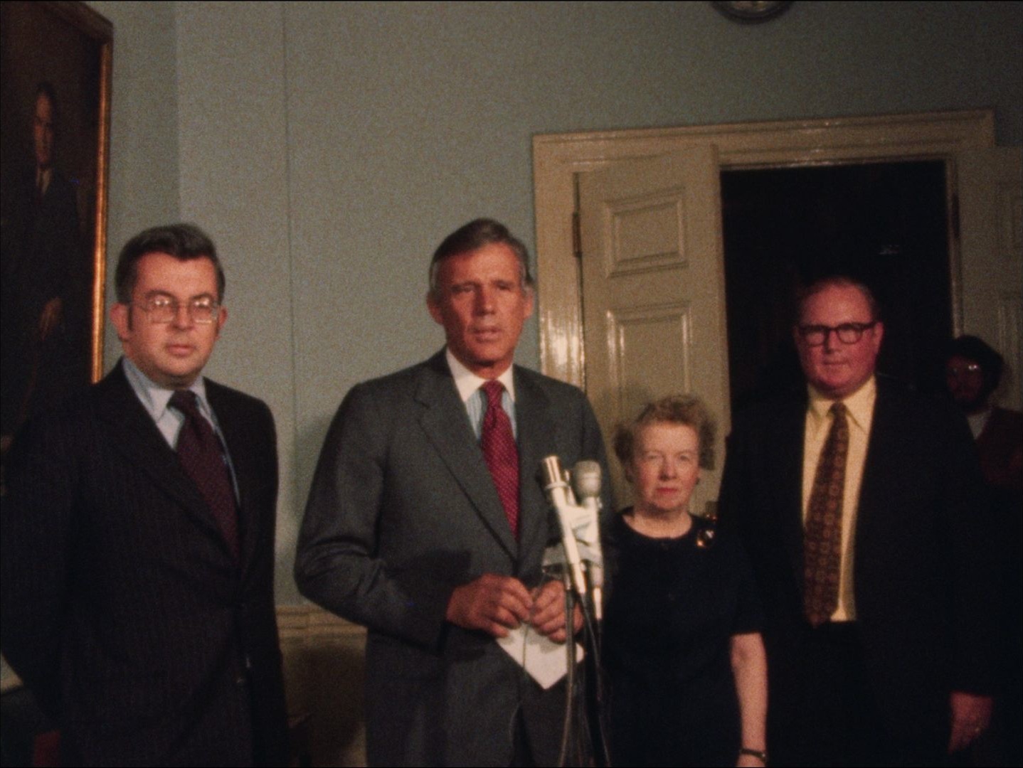 Description: "Leader: "P2 Threat on New Hampshire Gov #7454 3/2/74"; New Hampshire governor Meldrim Thomson Jr. and Attorney General Warren Rudman speak to the press about written threats received from the Symbionese Liberation Army and a threat that was sent to Representative James "Jim" Splaine. Joe Day reporter standup."