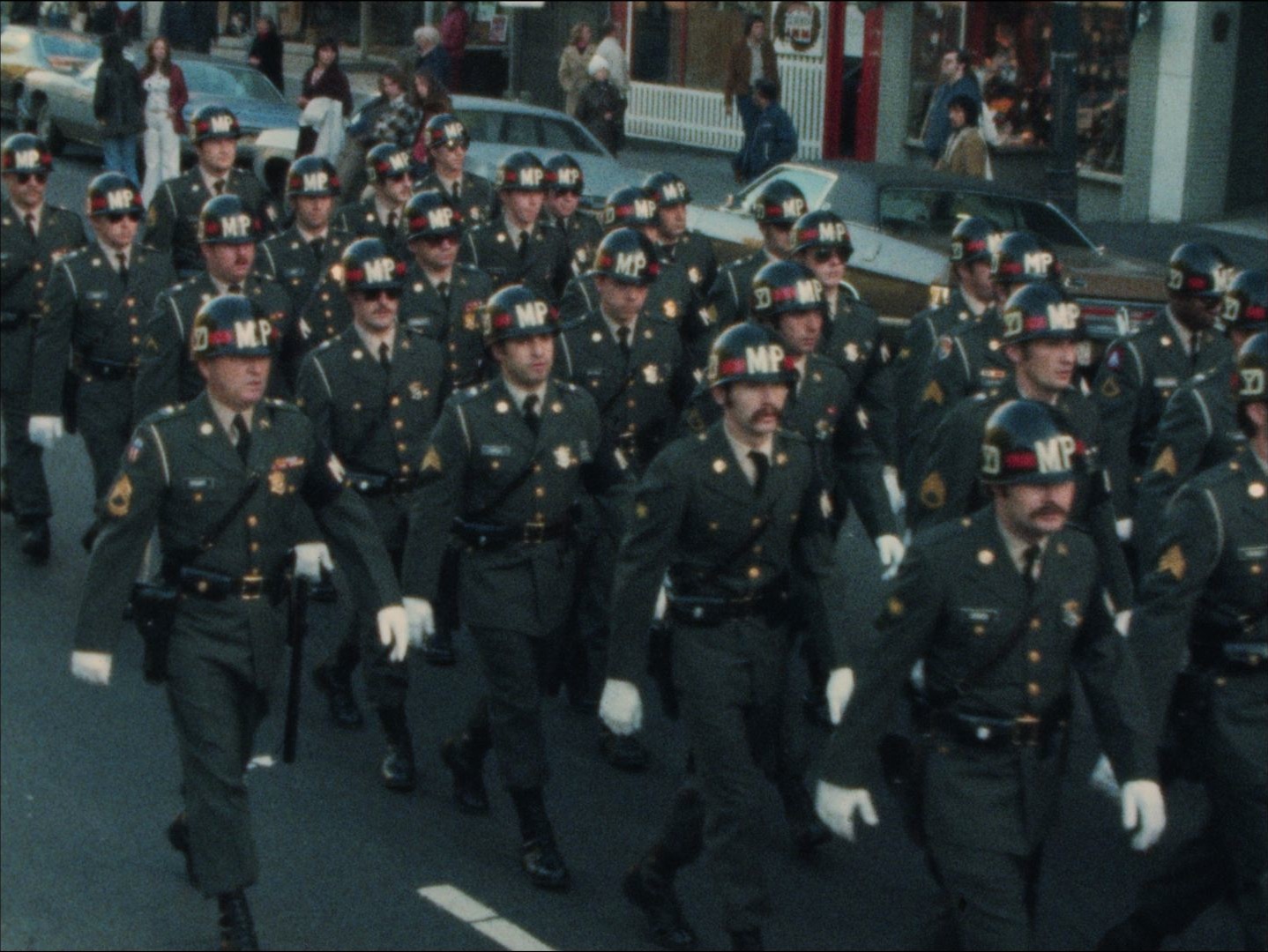 Description: Leader: P2 Veteran's Day #10341 10/28/74; Massachusetts state veteran groups ceremony to honor men and women killed in action at a ceremony in the State House Hall of Flags followed by silent footage of a Veteran's Day Parade in Boston. Unrelated footage in the middle of the reel of men getting out of buses with White Power on the side.