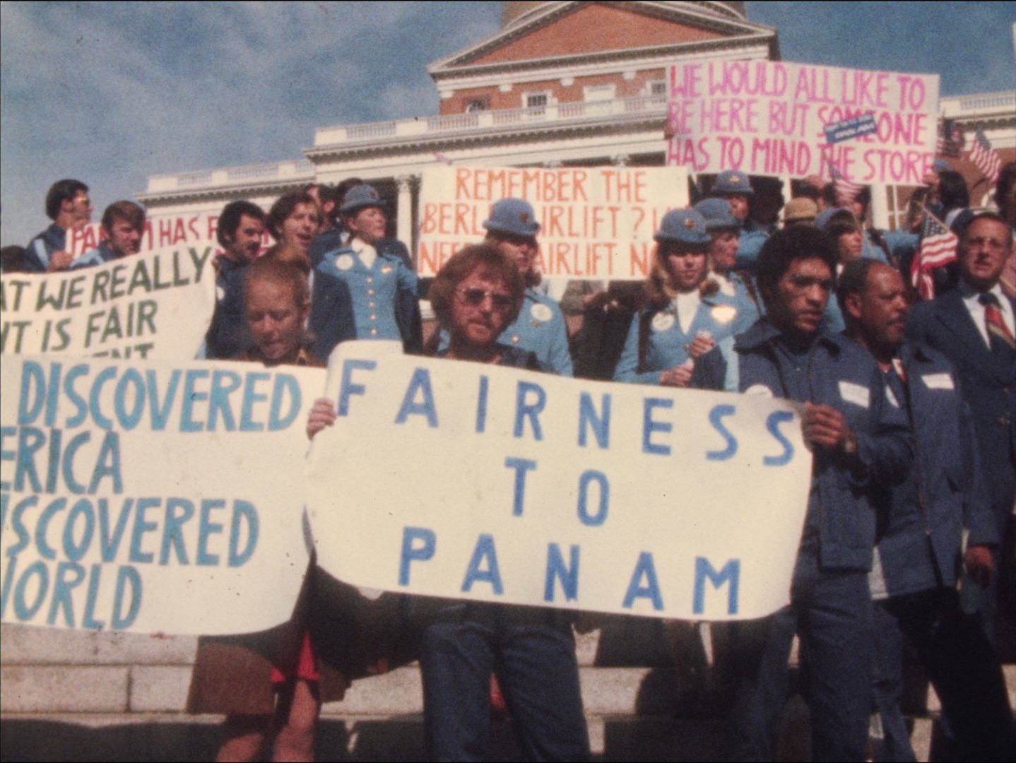 Description: Leader: P2 Pan Am Airline #10078 10/1/74; Mike Taibbi reporter voice over about an open letter in the newspaper from Pan Am employees lobbying for government support to help save the airline. Footage of airplanes and an empty terminal in Logan airport. Reporter standup about the negative impact that the energy crisis had on the airline's financials. Demonstration of Pan Am employees in front of the Massachusetts State House with signs and people chanting. Interviews with Pan Am employees about why they are protesting and legislation that they are supporting. More footage of the employees marching with signs and chanting Hey, hey what do you say, the government needs Pan Am!; Empty Pan Am terminal in Logan Airport; reporter outtakes; interview with a man from the Pan Am management; airport b-roll including air planes taxiing; close up of the ad in the newspaper. [image unstable in sections]