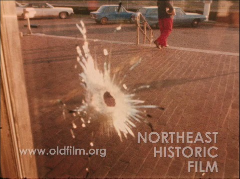 Silent footage shot from the outside of the Pru Cinema at 903 Boylston St. of signs and the marquee for the movie "Deep Throat." Some footage of men leaving the theater and shots of the lobby taken through the lobby doors.