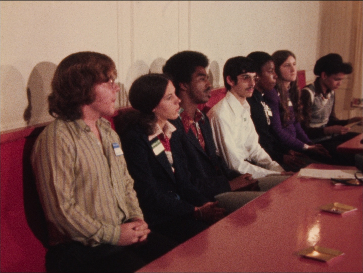Description: Leader: P2 Southern Kids #10509 11/14/74; Southern students who travelled from North Carolina, South Carolina, Mississippi, and Georgia to meet with Boston students about school integration. Nan Parati, one of the students visiting from Charlotte, speaks to an audience about visiting students in Boston. Visiting students get out of a bus and sign in at a table. Visiting students and local Boston students answer questions from the press and other students about the workshop and if they thought it was successful. Students walk into school in Brookline.