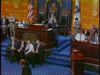 Description: In budget debate, House votes to institute Sunday lottery to generate funds for local aid and the arts council. Rep. Richard Voke mocks Channel 2. Reps. Marc Pacheco, William Constantino.