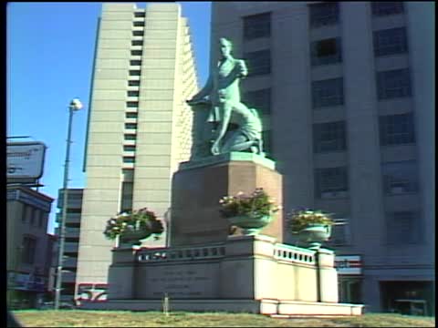 Description: Park Square environs. Carl Fischer Music store on Boylston Street. Entrance to Colonial Theater. Gilbert and Sullivan posters flank doors. Continental Trailways Bus sign and terminal. Park Square traffic. Emancipation statue of Abraham Lincoln and kneeling slave. Inscription on base: “A race set free and the country at peace. Lincoln rests from his labors.” Avis Rent a Car, Club Max, Teddy Bear Lounge, Park Square Lounge (“ladies invited”), Mouse Trap Cabaret marquee.