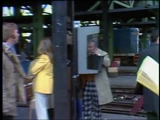Description: Commuter train terminal of North Station. Commuters wait on outdoor platform. PA voice announces track numbers, train stops, departure times. Two conductors talk to passenger. Railroad bed strewn with litter. Blue engine car. B&M (Boston and Maine) logo. Man reads newspaper while waiting. Man carries bouquet of flowers. Men carry briefcases. People move en masse to board train. Man smokes. Train slowly pulls out of station, sounds whistle.