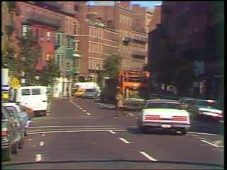 Description: Driving past Newbury Street storefronts and buildings. Emmanuel Church, Society of Arts and Crafts, Diutshfurs, Kakas Furs, New England Historic Genealogical Society, Cuoio, Priscilla Bridal, Josephs. Along Boylston Street - Sheraton Towers next to Pru, Lord & Taylor, Hotel Lenox, Boston Public Library, glass Hancock tower next to Trinity Church, Elkins, Louis, The Fatted Calf, Ken's, Malbens Gourmet, Casual Corner, Women's Educational and Industrial Union. Charles Street traffic, brick sidewalks, The Lyric Stage. Driving past brick rowhouses on Beacon Hill. Wrought iron balconies. Lower Commonwealth Avenue with grassy mall.