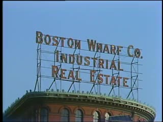 Description: South Station Fort Point Channel environs. Giant Hood milk bottle concession stand. Congress Street Wharf sign: “future home of Children's Museum and Museum of Transportation.” Brick industrial buildings. Traffic over bridge. View toward Federal Reserve Bank. Sign on roof: Boston Wharf Company Industrial Real Estate. Barbershop pole. Several ‘for sale’ signs on commercial properties. Varied fenestration on adjacent facades — window patterns of different architectural styles. Zoom in to Anthony's Pier 4 restaurant on distant wharf. Chinese storefronts and leather business signs on South Street.