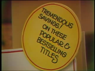 Description: Barnes & Noble bookstore at 395 Washington Street, Boston. Exterior and interior. People browse and read books on shelves and tables. Customers wait in line at cash registers. Signs for bargain basement, classical records, bestsellers, library copies, discounted paperbacks. Wide shot of bustling store.