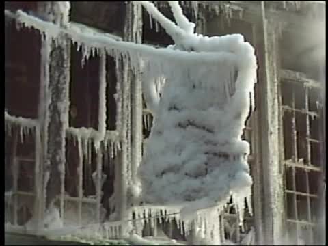 Description: Fire at 5 West Street Boston, housing the Brattle Book Shop. Firefighters on ladder aim hoses into upper windows. Ice chunks flow in street. Badly damaged books lie in puddles. Ice encrusts burnt out building. Icicles cover hydrant. Ken Gloss says loss is total (400,000 antiquarian books and rare manuscripts). He and his father George are determined to reopen in new location next week.