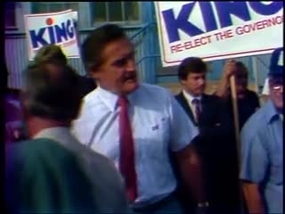 Description: Gov. Edward King campaigns for reelection, shaking hands with workers outside General Dynamics plant.