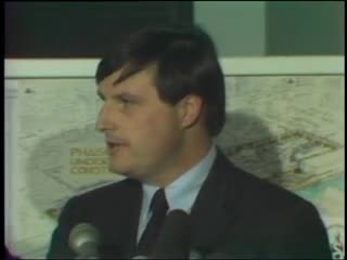 US Attorney William Weld, Jeremiah O'Sullivan, Jim Greenleaf of FBI hold press conference to announce indictments of Angiulos and associates of Patriarca family of La Cosa Nostra (mafia). Organized crime.