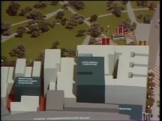 Description: Architectural scale model of Boston theater district showing proximity of Shubert, Charles Playhouse, Wilbur, Music Hall, Colonial, Essex, State, and Boston Repertory Theaters, NEMC, C-4 development parcel, Park Plaza Hotel, Stuart Street.