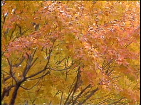 Autumn foliage. Close-ups and wide shots of trees full of yellow, orange, and light brown leaves. Chrysanthemums.