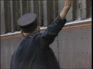 Description: PEOPLE WAITING FOR TRAIN AT HYANNIS RAILROAD STATION, CONDUCTOR. CAPE COD